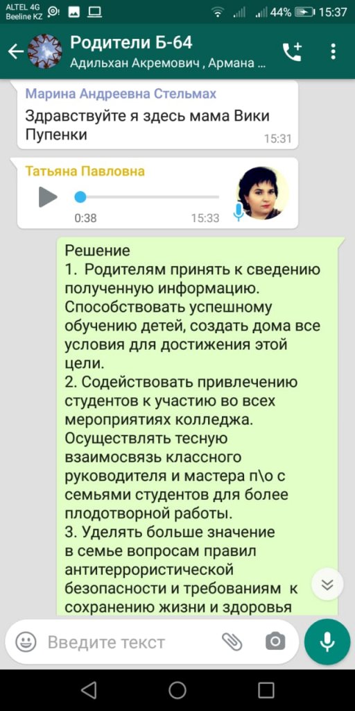 2021 жылғы 21 мамырда Б-64 тобында WhatsApp мессенджері арқылы қашықтан форматта ата-аналар жиналысы өтті.