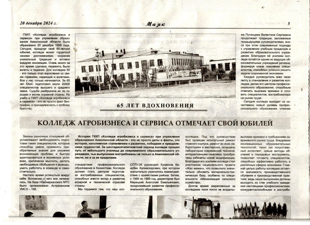 Ақмола облысы білім басқармасының жанындағы "агробизнес және сервис колледжі" МКҚК тарихы — бұл жай ғана күндер мен фактілер емес, бұл дамуға, жеңістерге және қиындықтарды жеңуге деген ұмтылысқа толы тарих. Алпыс бес жыл ішінде колледж шағын училищеден қазіргі...