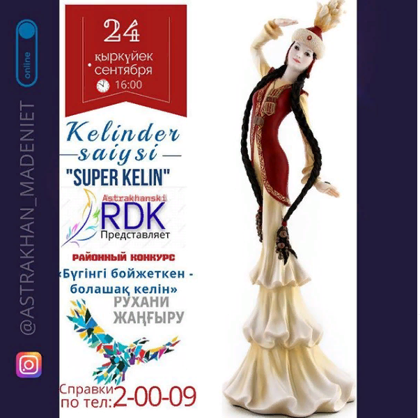 24 қыркүйек Аудандық мәдениет үйінде онлайн режимінде "Бүгінгі бойжеткен-болашақ келін" атты келіндер байқауы өтті. Өзінің өнерін ортаға салып, сайсқа бақ сынасқан колледждің әлеуметтік педагогы Абдибекова Сандуғаш Бақтыгелдіқызы.