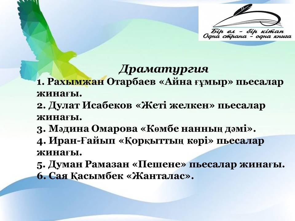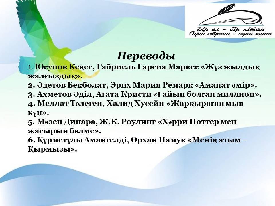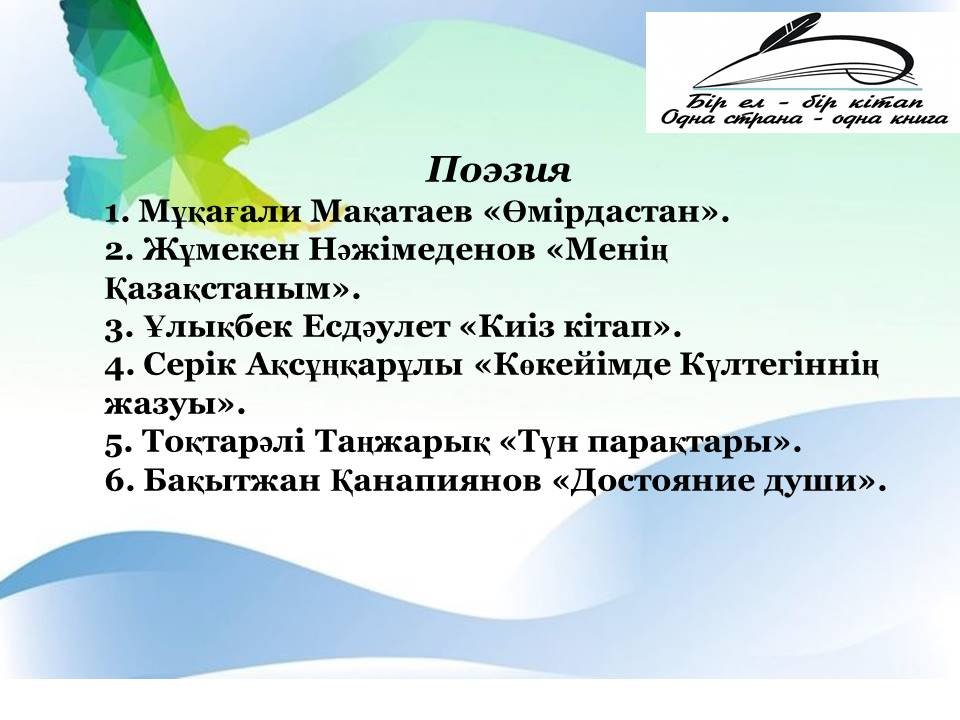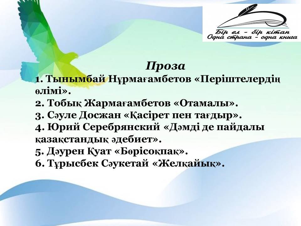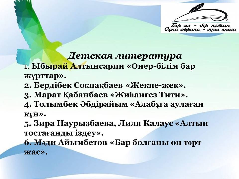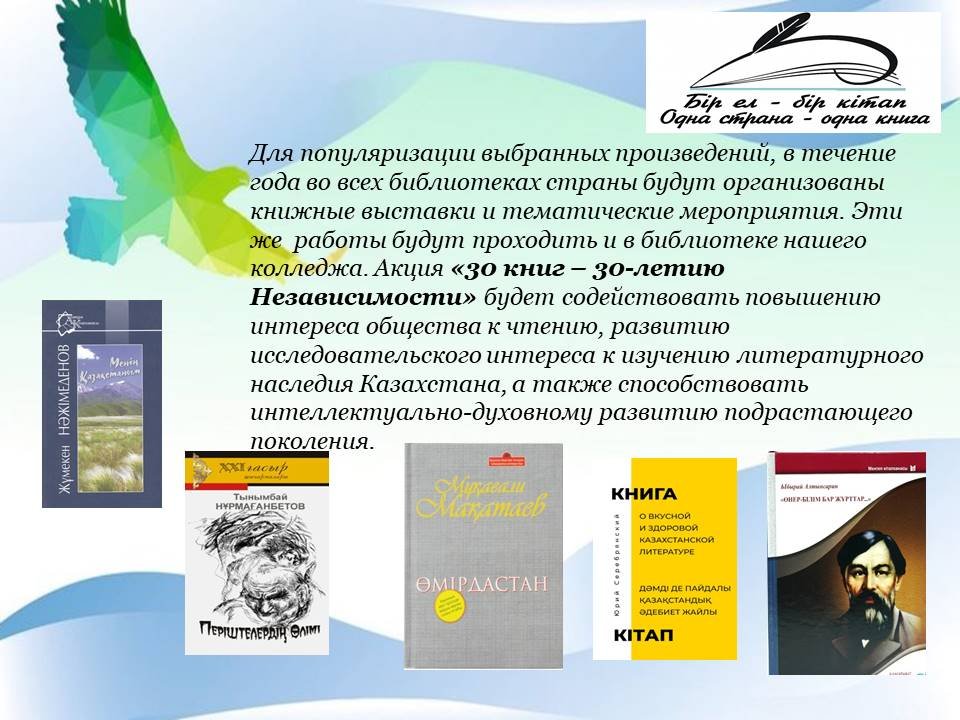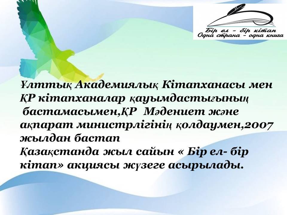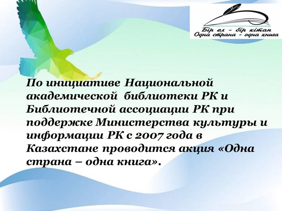 Ұлттық Академиялық Кітапханасы мен ҚР кітапханалар қауымдастығының бастамасымен, ҚР Мәдениет және ақпарат министрлігінің қолдаумен, 2007 жылдан бастап Қазақстанда жыл сайын « Бір ел- бір кітап» акциясы жүзеге асырылады.