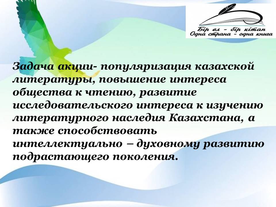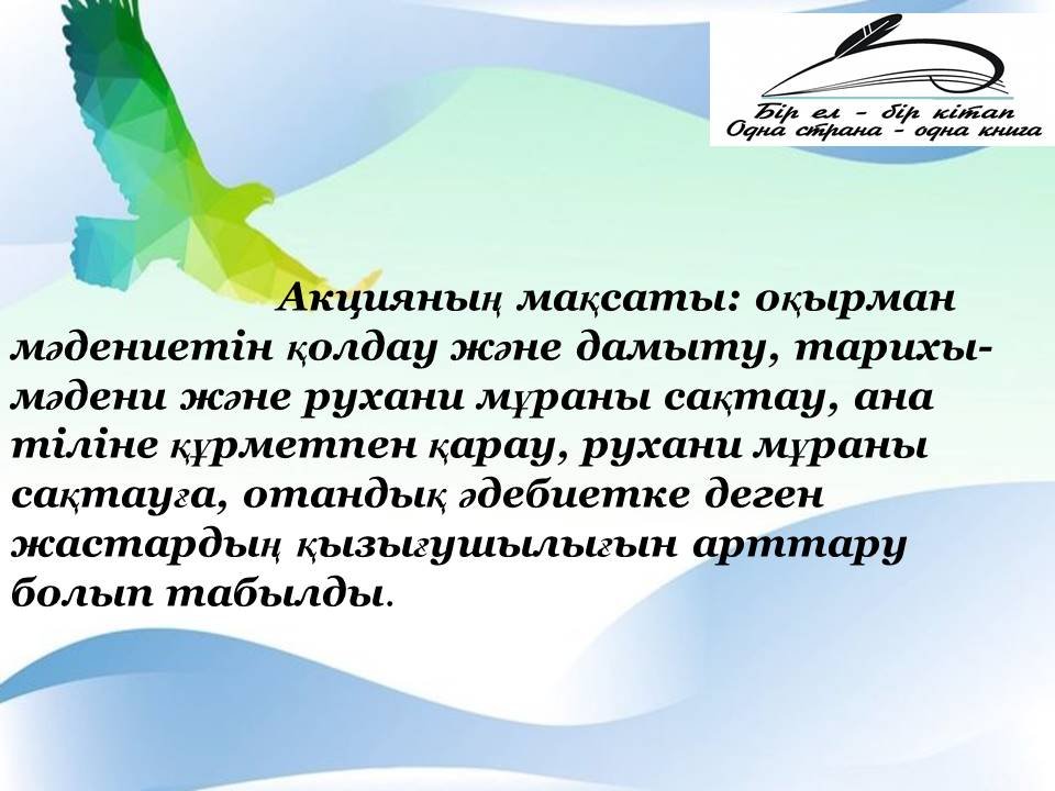 Акцияның мақсаты: оқырман мәдениетін қолдау және дамыту, тарихы- мәдени және рухани мұраны сақтау, ана тіліне құрметпен қарау, рухани мұраны сақтауға, отандық әдебиетке деген жастардың қызығушылығын арттару болып табылды.