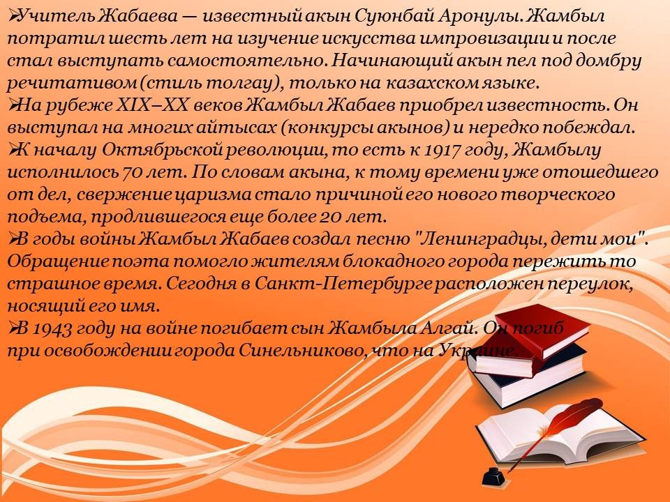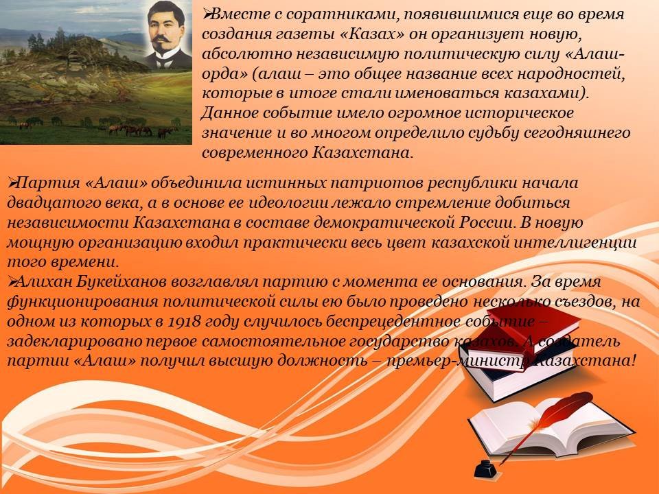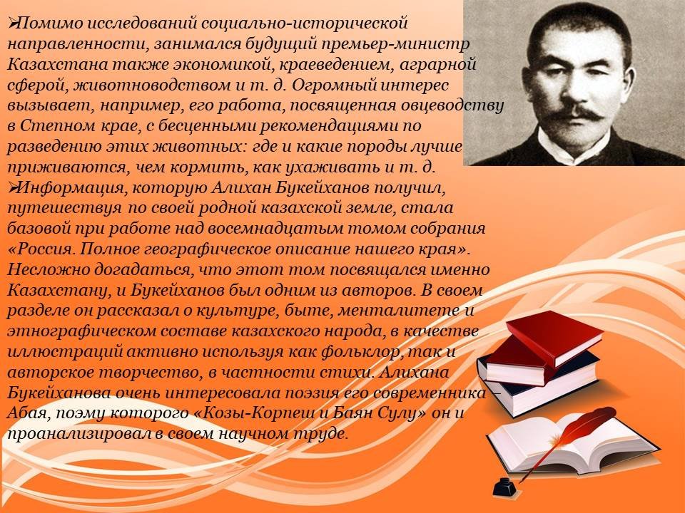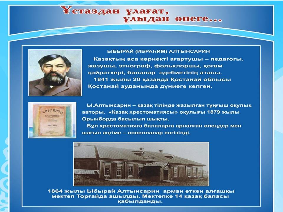 Кез келген халық өз саясаткерлерін, қоғам қайраткерлерін, ақындары мен жазушыларын мақтан тұтады. Қазіргі Қазақстанда бүкіл саналы ғұмырын сауатсыздықты жоюға, қазақ халқын орыс және әлемдік мәдениет құндылықтарына баулуға арнаған Ыбырай Алтынсариннің есімі ерекше құрметтеледі. Ыбырай Алтынсарин-XIX ғасырдың көрнекті ағартушысы, этнограф, ақын, прозашы, аудармашы. Оның күш-жігерінің арқасында қазақ жерінде қарапайым отбасылардың балалары оқи алатын алғашқы мектептер пайда болды.