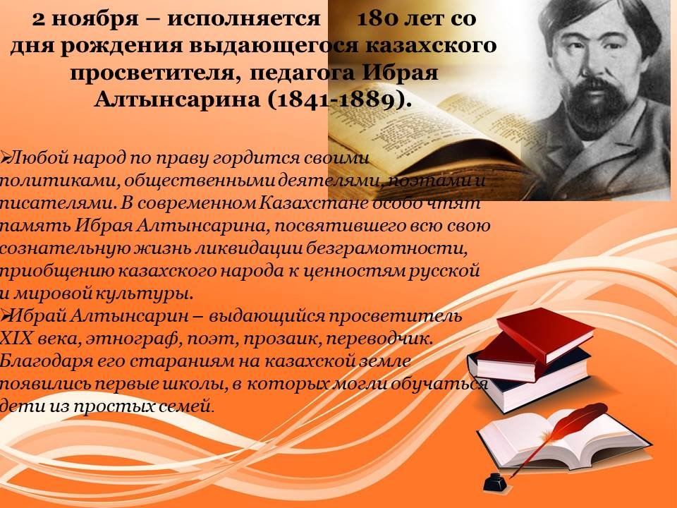 2 қараша-қазақтың көрнекті ағартушысы, педагог Ыбырай Алтынсариннің туғанына 180 жыл (1841-1889).