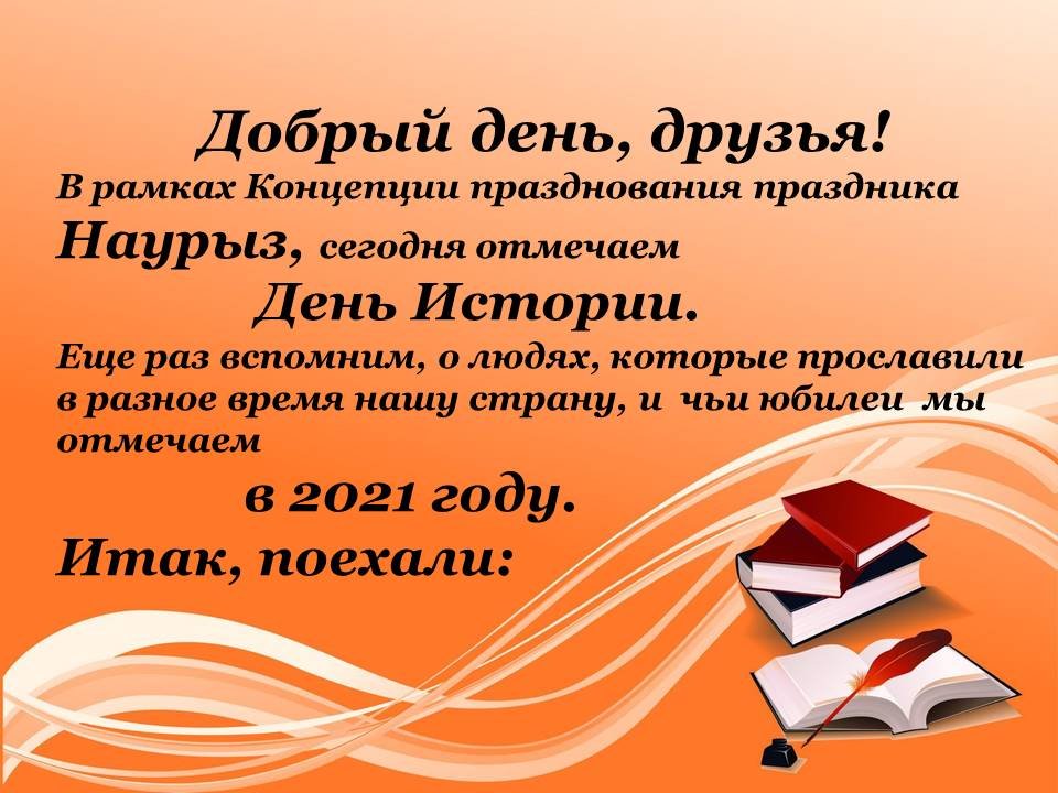 Наурыз мерекесін мерекелеу Тұжырымдамасы аясында бүгін тарих күнін тағы да еске аламыз, әр уақытта елімізді даңқтаған және 2021 жылы мерейтойларын атап өтетін адамдар туралы.