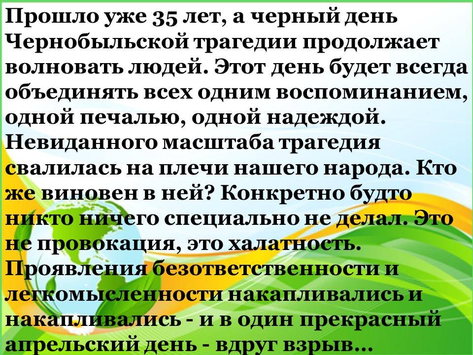 35 жыл өтті, Чернобыль трагедиясының қара күні адамдарды алаңдатады. Бұл күн әрқашан барлығын бір жадымен, бір қайғымен, бір үмітпен біріктіреді. Бұрын-соңды болмаған ауқымдағы трагедия халқымыздың мойнына түсті. Кім кінәлі оған? Осы күнге арналған бейне журналды қарап, Сіз мыналарды білесіз:
