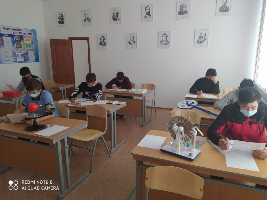Физика кабинеті интерактивті тақтамен, проектормен, маркерлік (мобильді) тақтамен, компьютерлік техникамен, веб-камерамен, заманауи теледидармен, зертханалық және практикалық жұмыстарға арналған жиынтықтармен жабдықталған. Кабинетте көрнекі және дидактикалық материалдарға арналған шкаф жиһазы, демонстрациялық үстелмен біріктірілген ыңғайлы мұғалім үстелі бар.