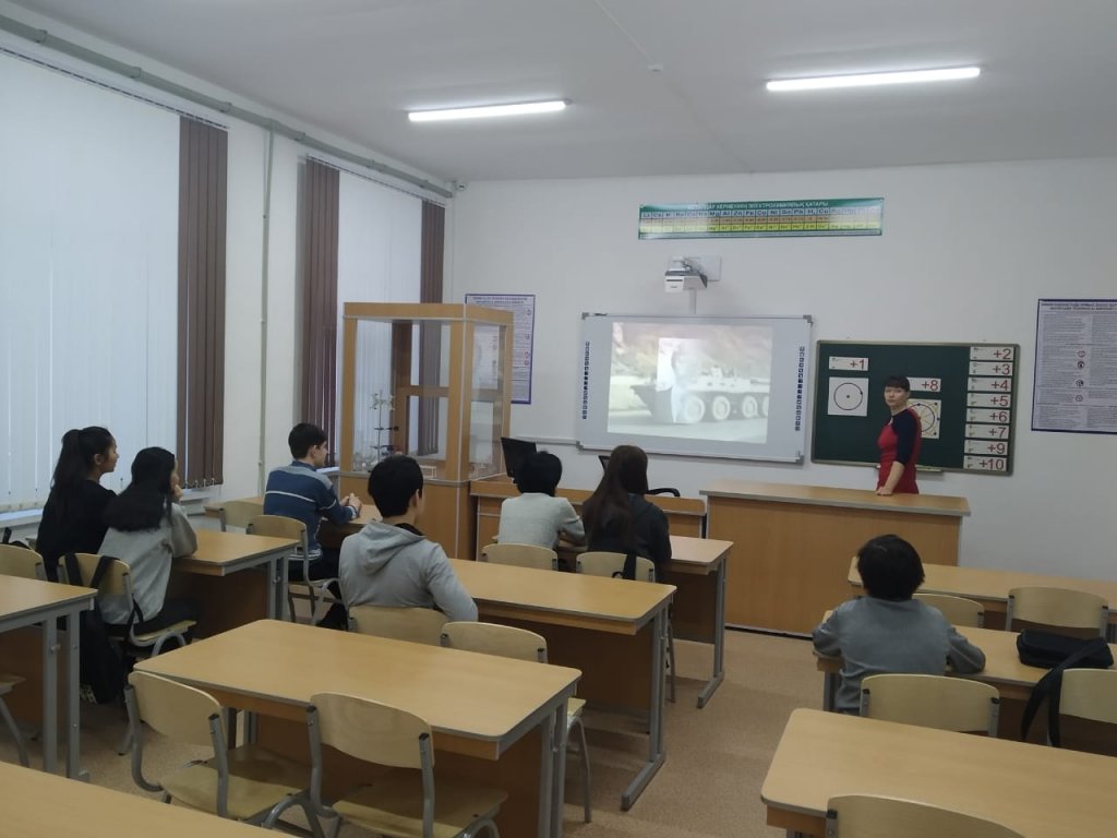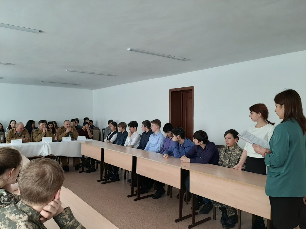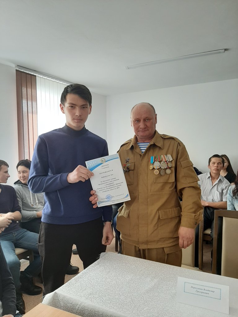 "Ауғандықтар" әскери өмірінен келген мысалдарда балаларға бәрін үйрету керек екенін көрсетті, ал пән әдеті экстремалды жағдайда өмір сүру мүмкіндігін едәуір арттырады. Сонымен қатар 2 курс студенттері Калашников автоматын бөлшектеу мен құрастыруды көрсетті. Шара соңында І дәрежелі Диплом Кабидуллова Аянға, ІІ дәрежелі Диплом Пелевин Мадиярға " Ауған соғысының тарихын білесің бе?". "Ауғанмен арпалысқан жандар" Диалогтық алаңы естелік фотомен аяқталды.